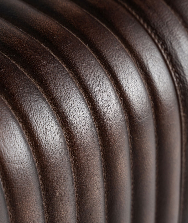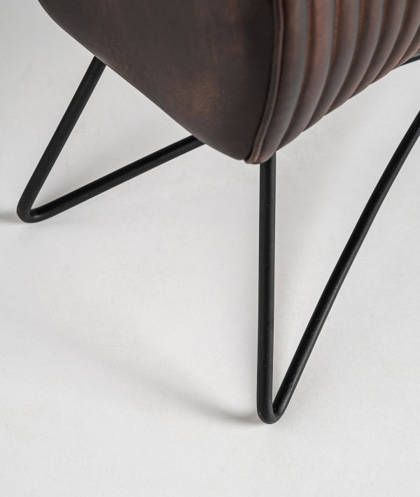 Brown leather stool with a black metal frame, measuring 82 × 31 × 50 cm. Its sturdy, modern design features a low back and padded seat with embossed lines, offering an industrial and contemporary style. Ideal for kitchen bars, islands, or bar areas, this stool combines functionality and aesthetics, fitting seamlessly into modern interiors. Its durable frame ensures long-lasting use, making it a practical and decorative addition to any space.
