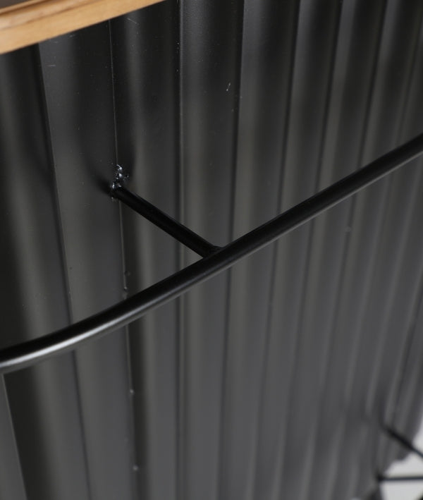 Black is synonymous with elegance, as demonstrated by the Meysse bar by Lasdtdeco. It is made of oak wood combined with iron and features two metal bars at the top and bottom, along with two large openings on the interior. 110x45x106 cm.