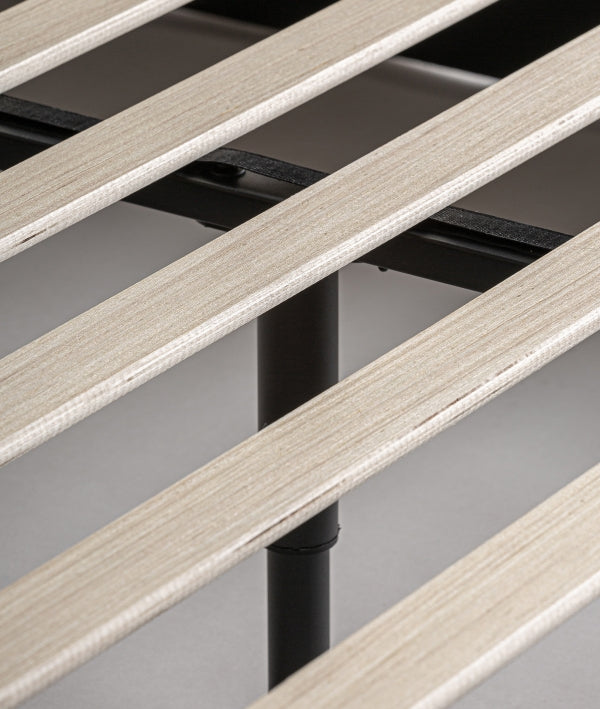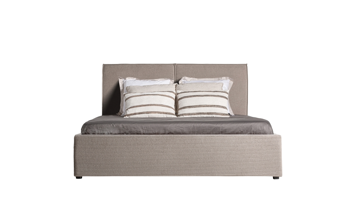 Contemporary design for stylish relaxation. This bed, upholstered in beige polyester with pine wood accents, combines comfort, simplicity, and a warm touch, making it ideal for serene and cozy spaces.