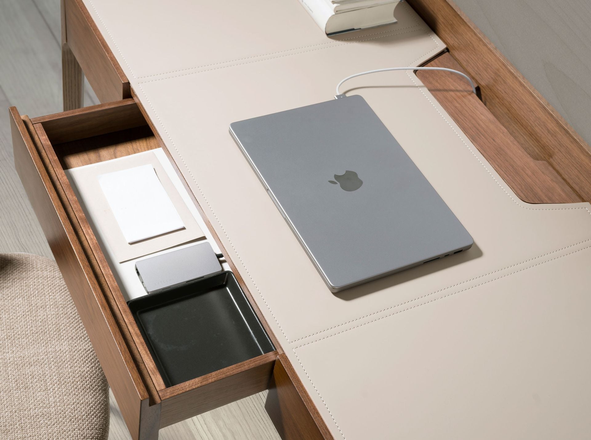 Desk with faux leather and walnut top