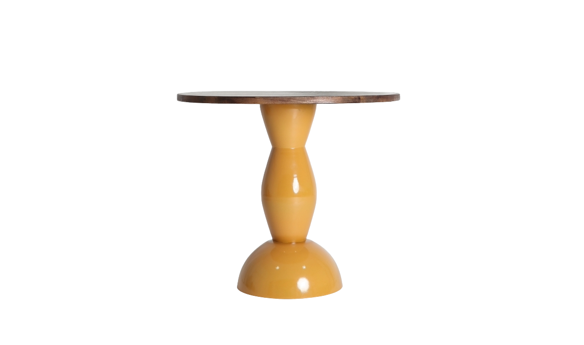 The Nahina dining table blends form and color in a bold design. Its glossy ochre iron base and brown mango wood top create a table full of energy and personality.