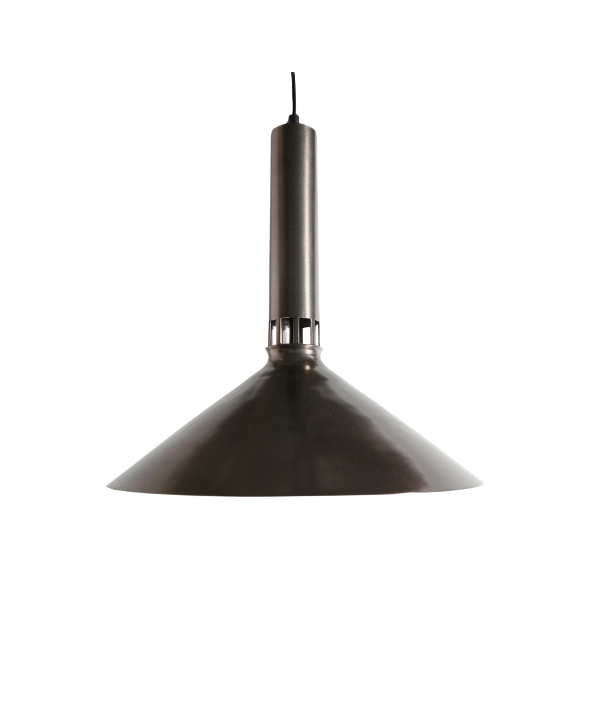 With a conical shape, this ceiling lamp stands out for its design and understated elegance. Made entirely of iron in an aged dark gold finish, it is perfect for the most sophisticated interiors. 34x34x130 cm.