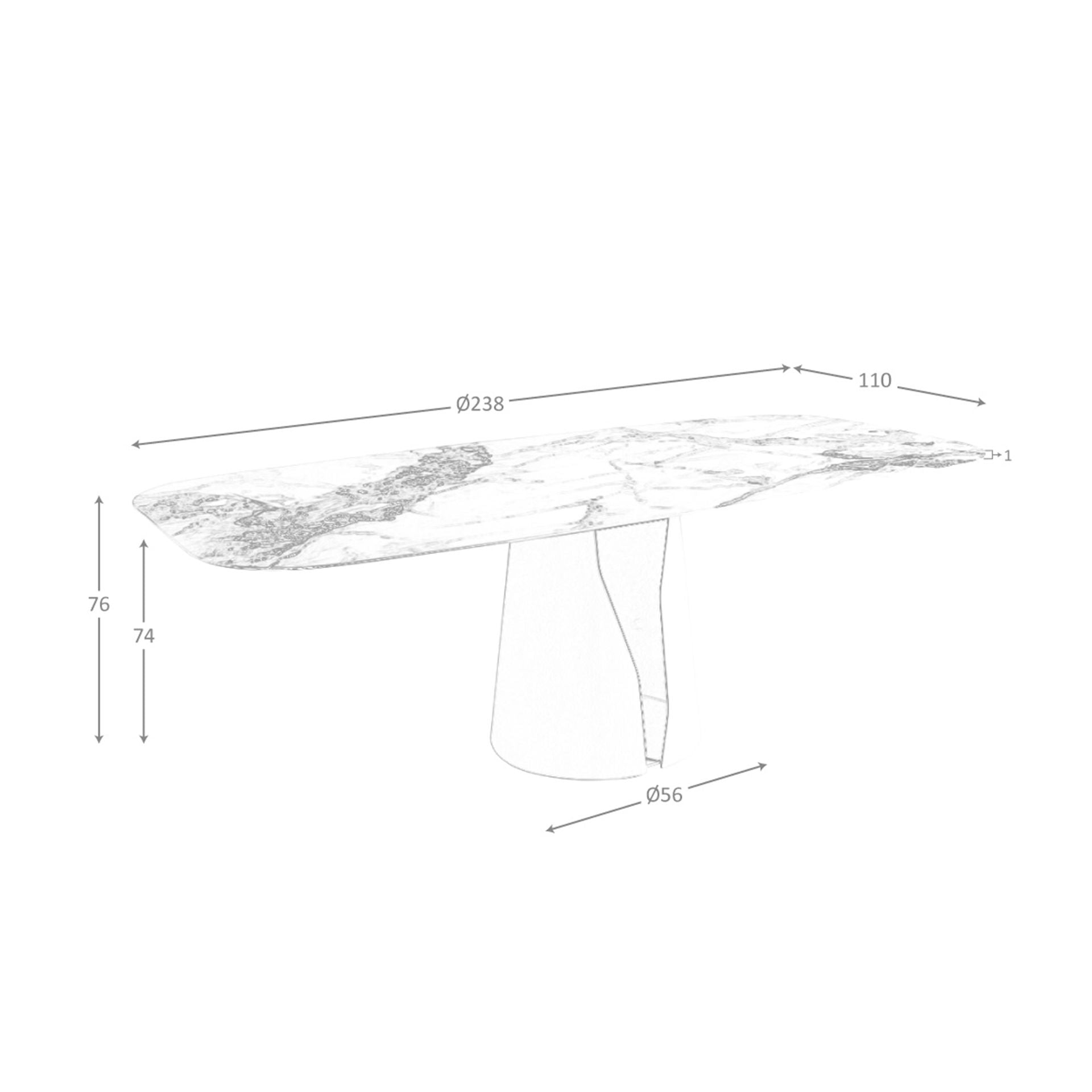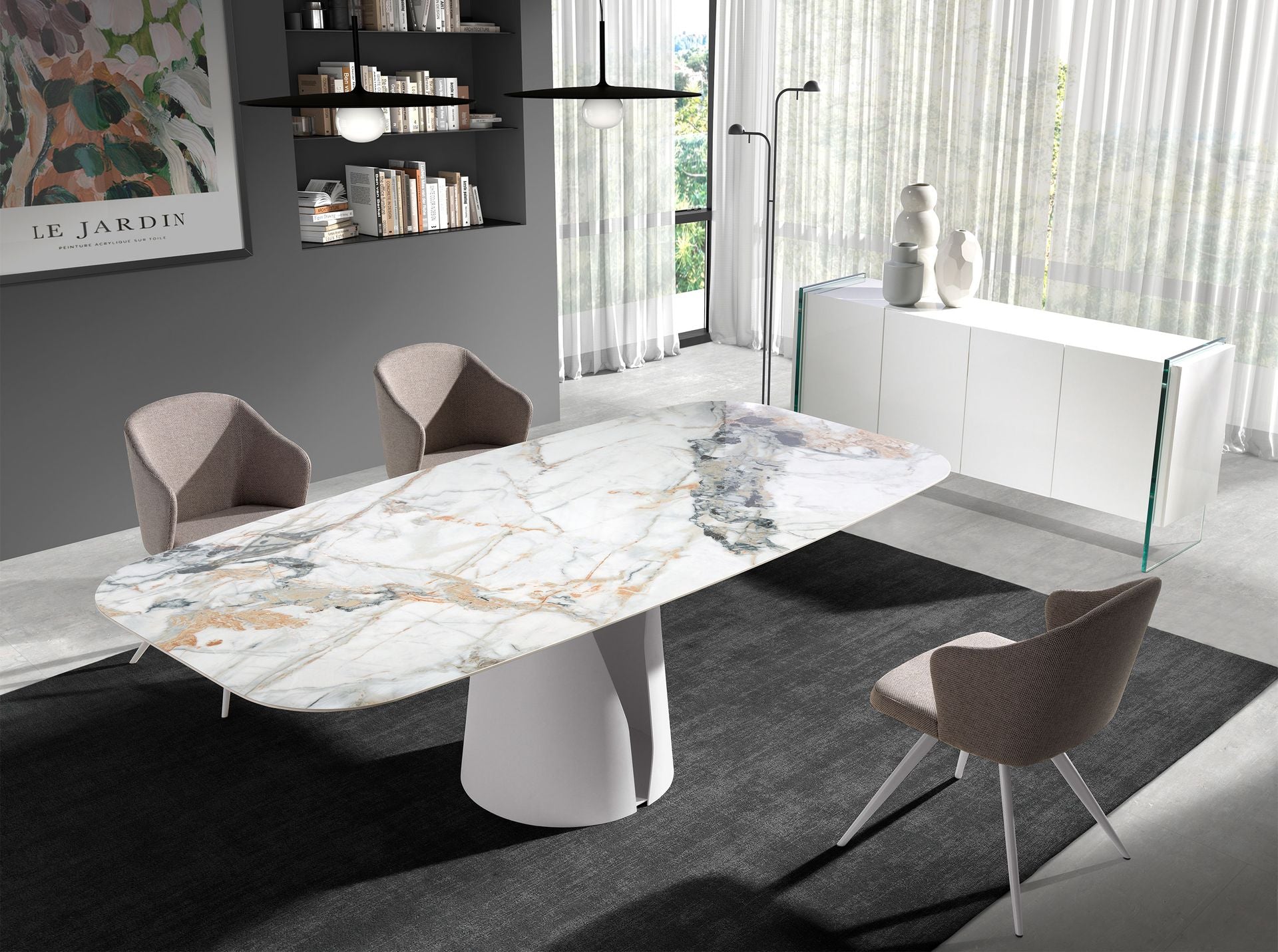 Oval barrel dining table in porcelain marble and white steel