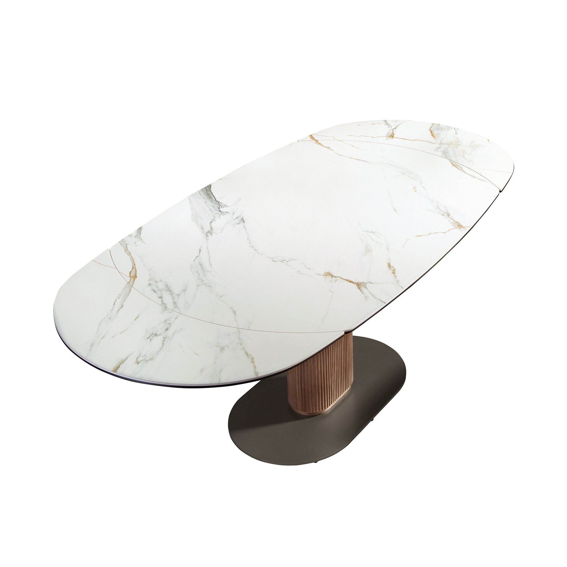 Oval extendable dining table with porcelain marble and walnut barrel
